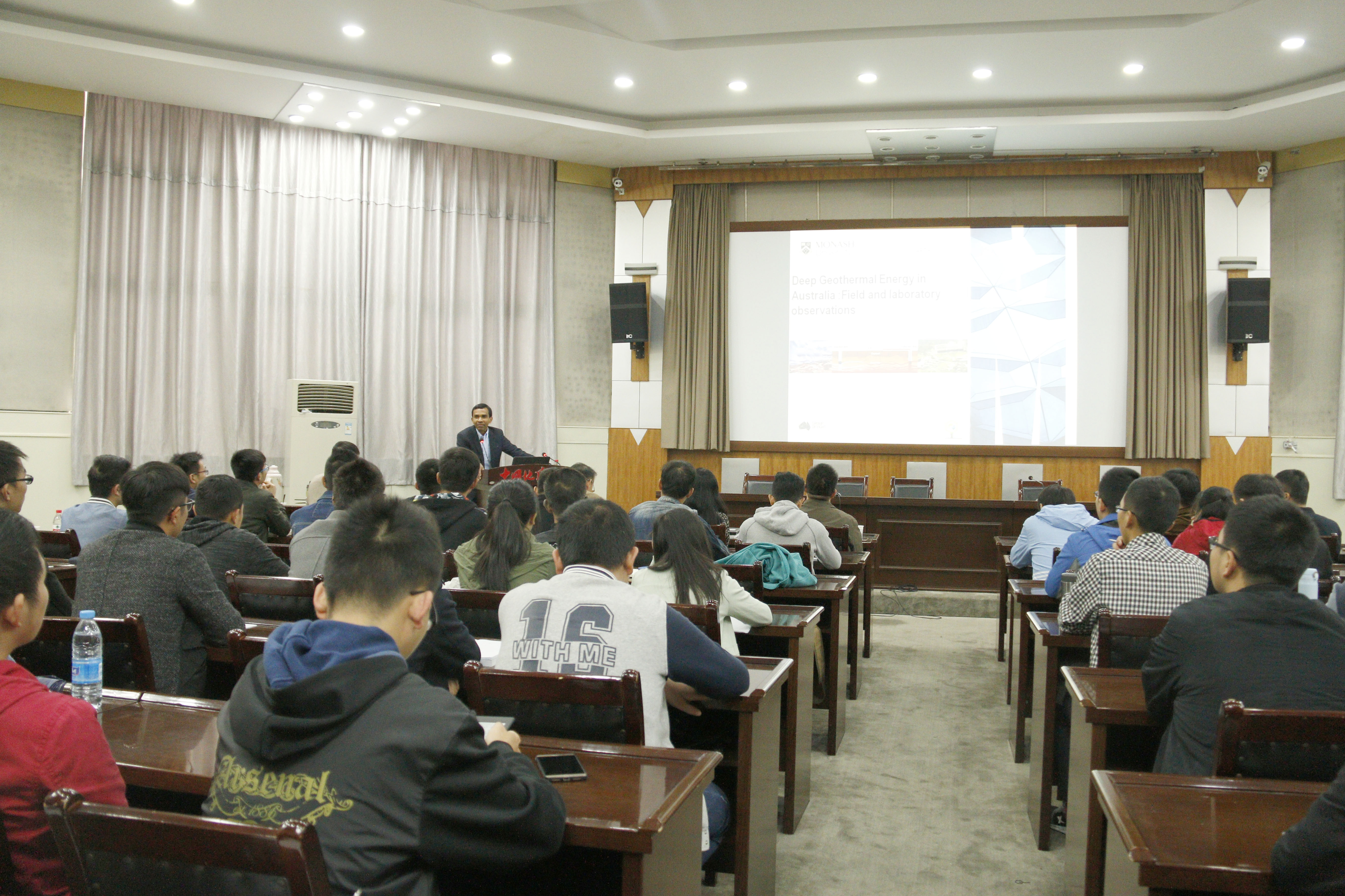 10月17日下午,澳大利亚莫纳什大学深部地球能源实验室主任Ranjith Pathegama Gamage教授来校作了主题为“Enhanced Geothermal Energy prospects in Australia: Field and laboratory observations”的学术报告。2138太阳集团官网院长焦玉勇教授主持了报告会,学院200余名师生聆听了报告。