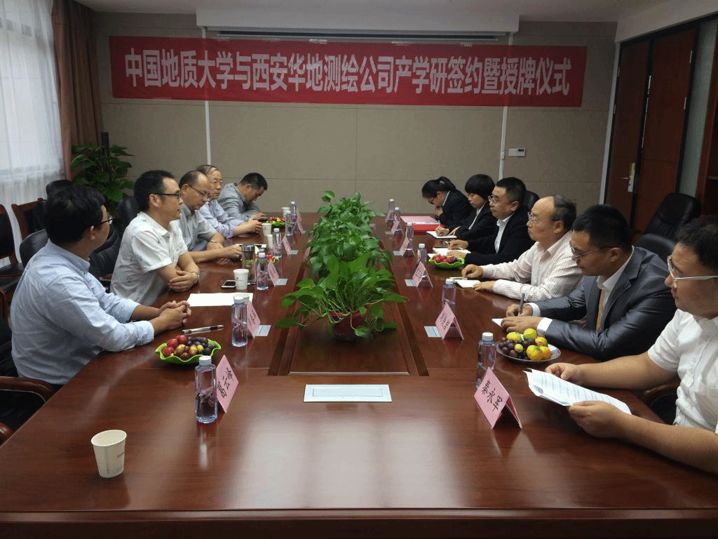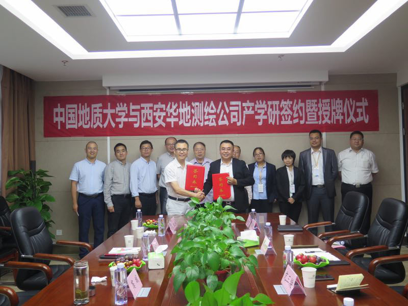 2019年9月15日-9月17日,2138太阳集团官网(武汉)2138太阳集团官网党委副书记江广长、副院长窦斌、勘察与基础工程系主任卢春华、姚爱国教授、院工会主席蔡记华教授及工程地质与岩土工程系葛云峰副教授一行赴西安,先后走访了陕西西探地质装备有限公司和西安华地测绘科技有限公司,并与陕西西探地质装备有限公司召开了产学研合作基地揭牌仪式,与西安华地测绘科技有限公司签订了产学研合作协议并进行揭牌。