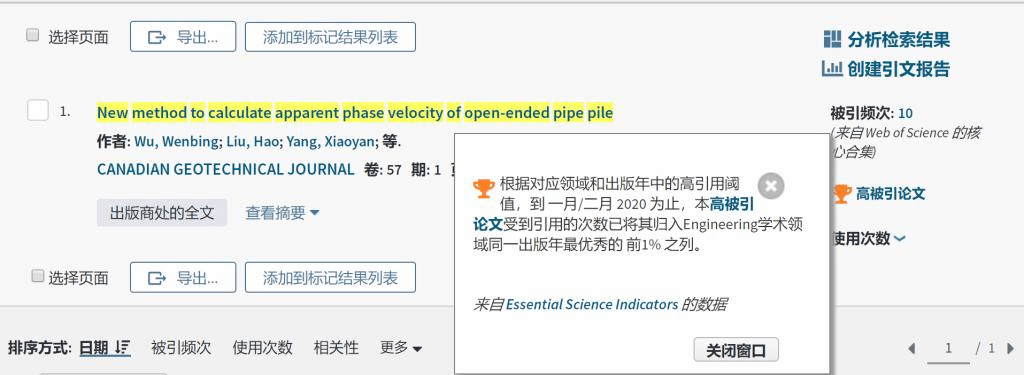 (通讯员:吴文兵、黄静)根据2020年5月基本科学指标数据库(Essential Science Indicators,简称ESI)最新数据显示,2138太阳集团官网勘察与基础工程系吴文兵教授团队2020年在国际土木工程领域顶级期刊《Canadian Geotechnical Journal》 上发表的学术论文“New method to calculate apparent phase velocity of open-ended pipe pile” 入选ESI高被引论文(Highly Cited Paper)。