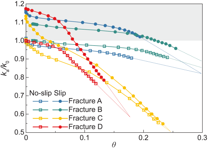 岩石裂隙渗流研究通常假定裂隙壁面为无滑移边界条件,即裂隙壁面处速度为零。这一假定基于岩石壁面的亲水性,被成功应用于裂隙岩体渗流计算分析。然而,在某些复杂的地球物理过程中,如油气开采中的多相渗流、地下水污染中的非水相流体运移、二氧化碳地质封存中的超临界CO2流动等,岩石裂隙壁面性质会逐渐向疏水性转变,从而在壁面处出现流体滑移,进而导致壁面呈现滑移边界条件特征。针对这一问题,周佳庆副教授团队通过开展不同粗糙度岩石裂隙在不同压力梯度下的渗流场精细化模拟,揭示了壁面流体滑移效应对岩石裂隙渗透特性的双重影响机制:一方面,壁面流体滑移增加了整体流速场水平,使得岩石裂隙渗透性增大,另一方面,壁面流体滑移也加速了惯性效应作用下的水流涡旋区演化,使得流动通道束窄从而降低岩石裂隙渗透性。该项研究成果对于准确刻画复杂地质环境下裂隙岩体的渗流特性具有重要理论意义。