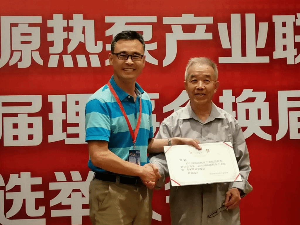 国际地热协会理事、中国能源研究会地热专业委员会专家委员会主任郑克棪教授为窦斌颁发聘书
