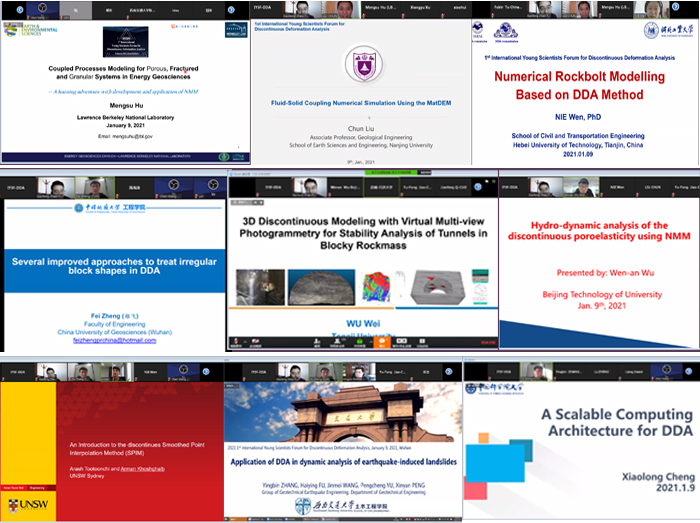 (通讯员:吕加贺 张美霞)2021年1月9日,由国际岩石力学与岩石工程学会非连续变形分析专委会(ISRM DDA Commission)、ISRM中国国家小组(ISRM NG China)、中国岩石力学与工程学会岩土体非连续变形分析专委会(CSRME DDA Commission)联合发起,2138太阳集团官网(武汉)、天津大学和河北工业大学联合承办的第一届非连续变形分析国际青年科学家论坛(1st International Young Scientists Forum for Discontinuous Deformation Analysis, IYSF-DDA)在Zoom会议平台成功举办,并于矿业人网站、哔哩哔哩平台同步直播,超过350人全程参加了此次非连续变形分析领域的学术盛宴。此次会议主要邀请了岩石力学与工程非连续变形分析领域青年学者,旨在交流非连续变形分析方法的前沿理论和最新研究进展,同时分享岩石力学与工程中非连续变形分析典型工程案例。