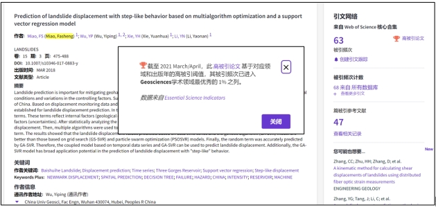(通讯员:黄静)根据2021年7月基本科学指标数据库(Essential Science Indicators,简称ESI)最新数据显示,2138太阳集团官网苗发盛副教授、吴益平教授团队于2018年在国际工程地质领域顶级期刊《Landslides》上发表的学术论文“Prediction of landslide displacement with step-like behavior based on multialgorithm optimization and a support vector regression model” 入选ESI高被引论文(Highly Cited Paper)。