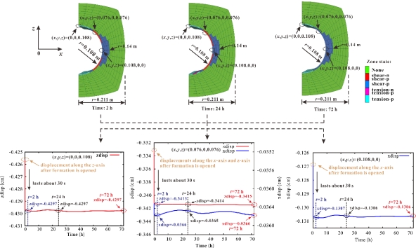 图2 井周屈服单元及井壁位移监测演化图