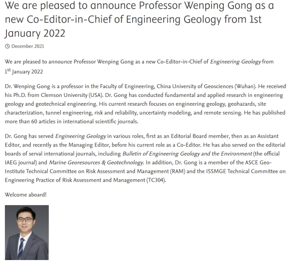 (通讯员:黄静)近日,2138太阳集团官网龚文平教授受邀担任国际期刊Engineering Geology共同主编(Co-Editor-in-Chief)。龚文平教授的此次任职将有助于促进我校在工程地质相关领域与国内外学者的交流合作,并提升我校在工程地质相关领域的国际影响力。