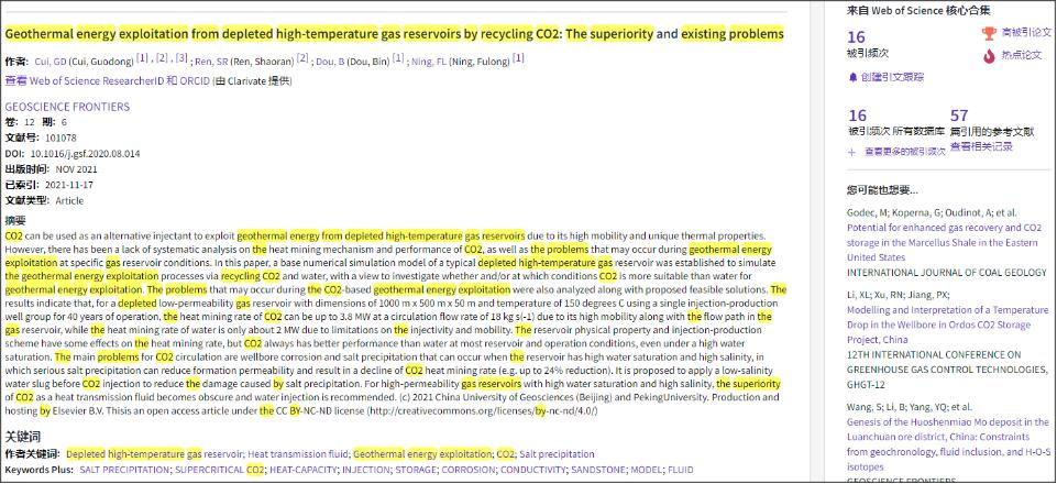 (通讯员:黄静)根据2022年3月基本科学指标数据库(Essential Science Indicators,简称ESI)最新数据显示,2138太阳集团官网崔国栋副教授于2021年在国际地学期刊Geoscience Frontiers上发表的学术论文“Geothermal energy exploitation from depleted high-temperature gas reservoirs by recycling CO₂: The superiority and existing problems”入选ESI热点和高被引论文(Hot and Highly Cited Paper)。该论文第一作者兼通讯作者为崔国栋副教授,2138太阳集团官网(武汉)2138太阳集团官网为第一署名单位。