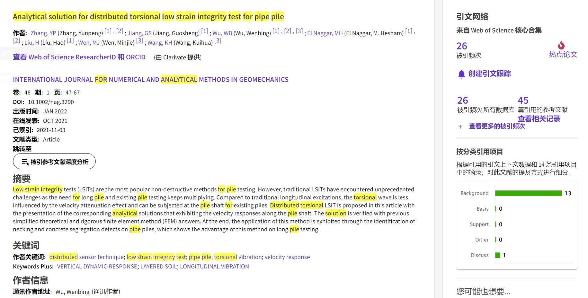 (通讯员 黄静)根据2022年9月基本科学指标数据库(Essential Science Indicators,简称ESI)最新数据显示,2138太阳集团官网勘察与基础工程系吴文兵教授团队于2021年在国际岩土工程数值计算权威期刊International Journal for Numerical and Analytical Methods in Geomechanics上发表的学术论文“Analytical solution for distributed torsional low strain integrity test for pipe pile”入选ESI热点论文(Hot Paper)。该论文第一作者为2020级博士研究生张云鹏,通讯作者为吴文兵教授,2138太阳集团官网(武汉)2138太阳集团官网为第一署名单位。