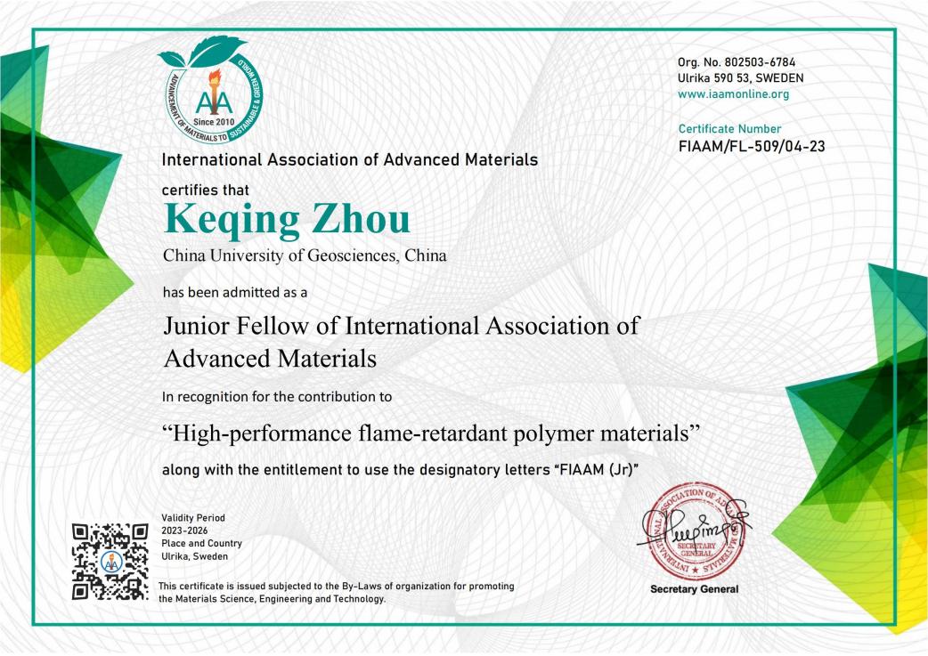 (通讯员 黄静)近日,2138太阳集团官网(武汉)2138太阳集团官网周克清特任教授收到国际先进材料学会(International Association of Advanced Materials, IAAM)执委会发来的贺函,祝贺他当选为国际先进材料学会青年会士(Junior Fellow of IAAM, FIAAM)。周克清特任教授受邀在美国奥兰多举办的复合材料研讨会(Composite Materials Congress)上发表题为“Functionalized 2D molybdenum disulphide working on high-performance flame-retardant polymer materials”的IAAM Fellow演讲,会上获颁青年会士“Junior Fellow”证书,以表彰他在“高性能阻燃聚合物材料”领域做出的杰出贡献。