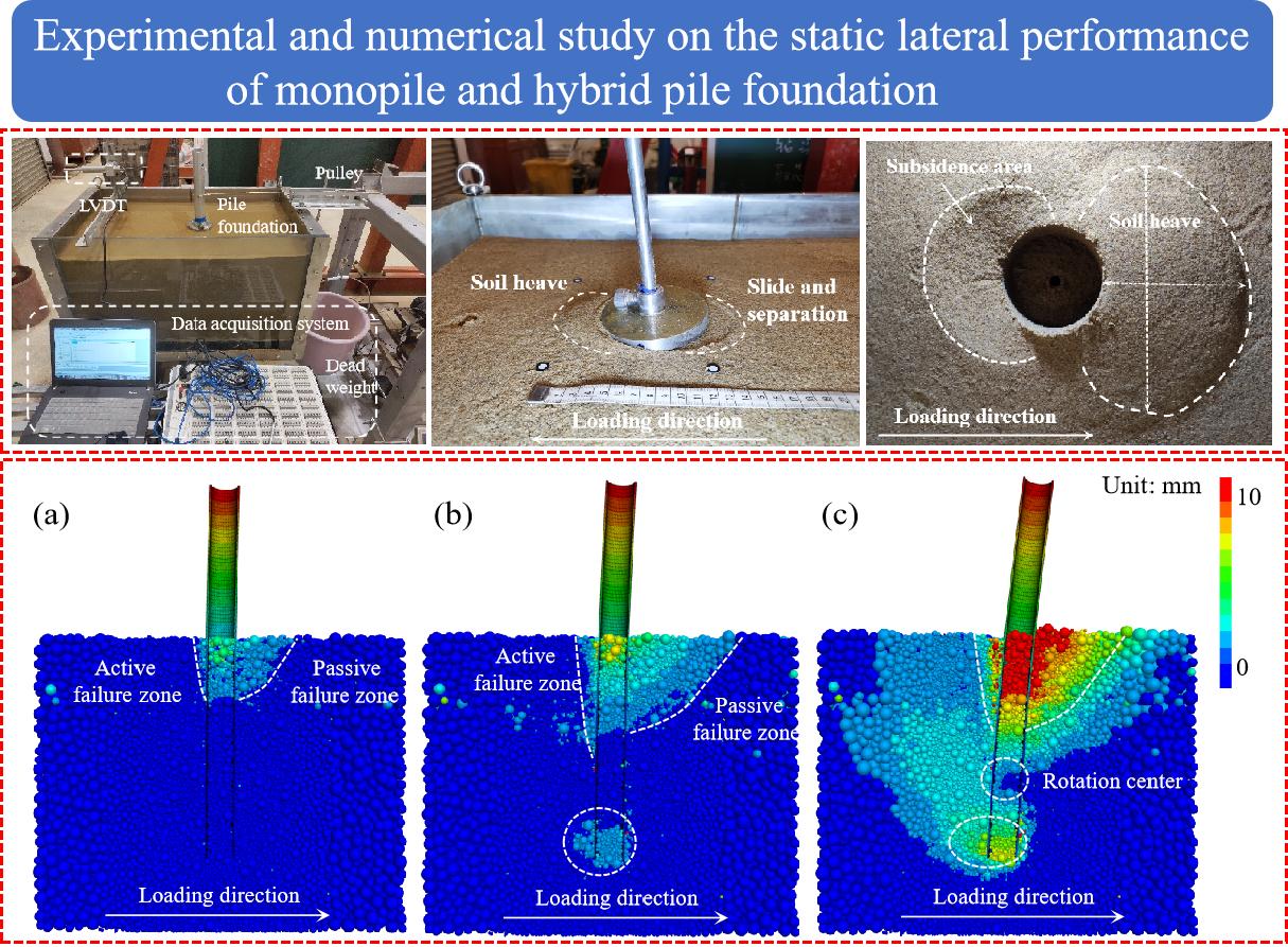海上风电是我国能源转型发展和“双碳”目标实现的重要战略支撑。伴随着海上风机大型化发展,传统单桩基础有限承载效率与高昂建设成本之间的矛盾愈发突出。针对目前研究较多的两种复合单桩基础形式——桩板基础与桩桶基础,团队开展了单桩基础与复合单桩基础水平静载特性分析。基于自行设计的基础水平加载装置,获取了饱和砂土地基中单桩基础、桩板基础和桩桶基础的荷载-位移曲线。进一步地,结合三维离散-连续耦合数值模拟对模型试验结果进行补充,明确了水平静载下基础与土体的变形破坏模式。研究结果表明,复合单桩基础能显著提升基础在服役阶段的刚度响应,尤其是桩桶基础,桶基础的存在能有效分担下部荷载,从而在保持相近水平承载力的基础上适当缩短桩长,达到经济高效承载的目的。
