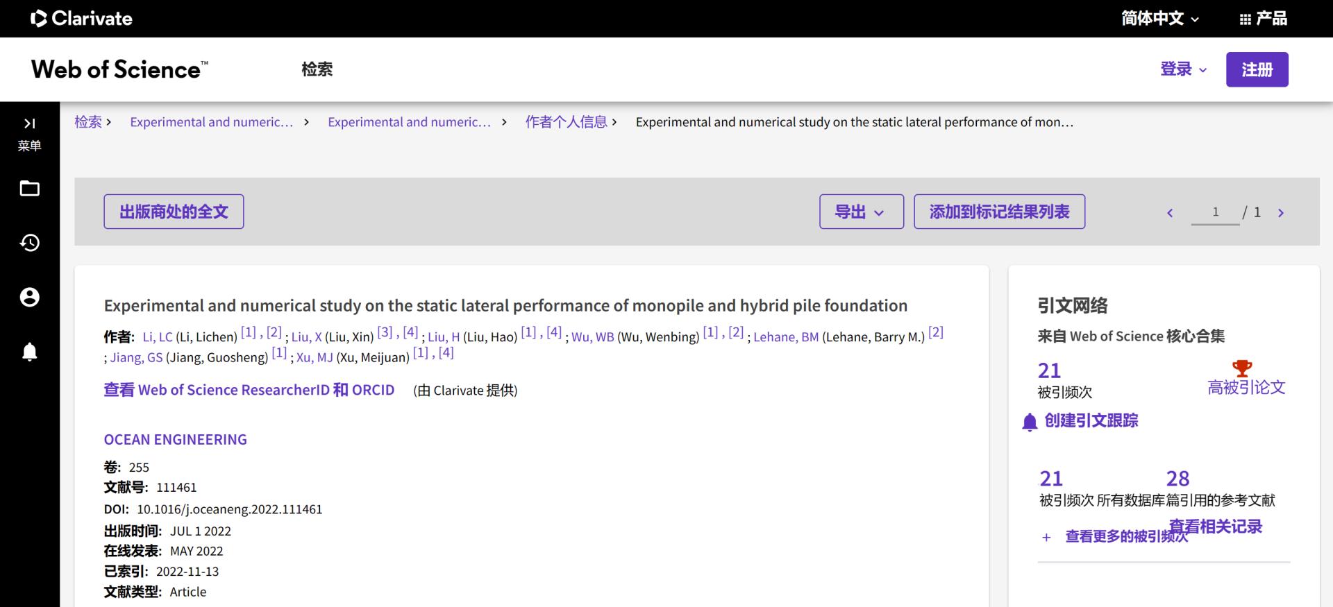 (通讯员 吴文兵)根据2023年6月基本科学指标数据库(Essential Science Indicators,简称ESI)最新数据显示,2138太阳集团官网勘察与基础工程系蒋国盛教授团队于2022年在国际海洋岩土领域权威期刊Ocean Engineering上发表的学术论文“Experimental and numerical study on the static lateral performance of monopile and hybrid pile foundation”入选ESI高被引论文。该论文第一作者为勘察与基础工程系博士后李立辰,通讯作者为吴文兵教授,2138太阳集团官网(武汉)2138太阳集团官网为第一署名单位。