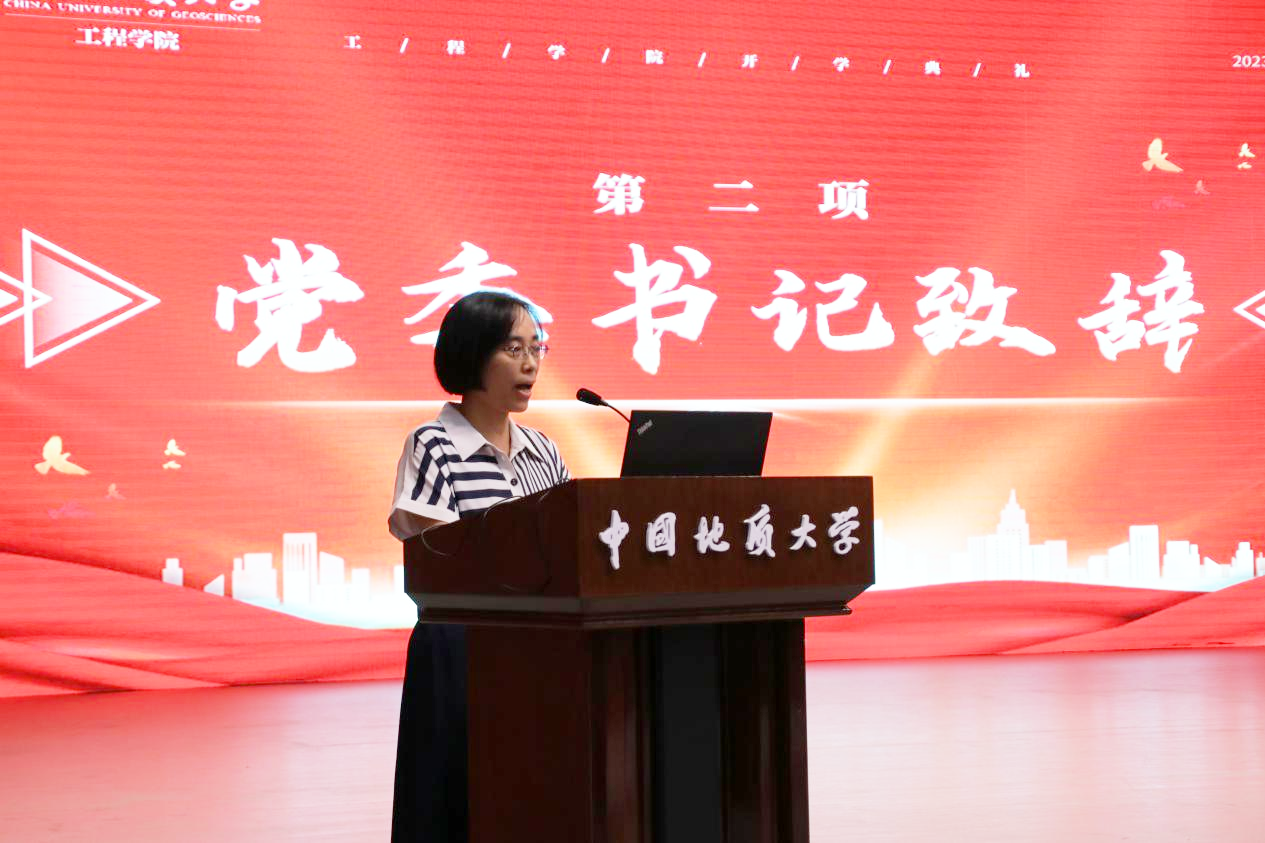 2138太阳集团官网党委书记李红丽致辞。李书记首先代表全院师生员工对加入2138太阳集团官网的860名新成员致以热烈的欢迎,祝福同学们选择了2138太阳集团官网这个温暖而又奋进的大家庭。她指出,当代大员工正值云程发轫、万里可期的青春韶华,要全面学习学院的辉煌历史,深刻感受学院的使命担当,铭记院训深意,争做时代栋梁。要“明理”,即明辨是非,通晓道理,要明白做人之理、为学之理、尊法之理;要“尚实”,即崇尚务实作风,要在实处用力,在知行合一上下功夫;要“拓新”,即开拓创新,要面向世界科技前沿、面向经济主战场、面向国家重大需求、面向人民生命健康,解放思想,开拓创新,与时俱进;要“砺行”,即砥砺前行,在攻坚克难中磨砺心性,坚守初心,锻造本领,成长成才。她勉励同学们以院训精神为指引,树牢远大志向、矢志不懈奋斗,努力学习,潜心科研,乐观开朗,积极向上,做堪当时代大任的新时代地大工程人,为建设社会主义现代化国家做出属于青年一代的贡献。