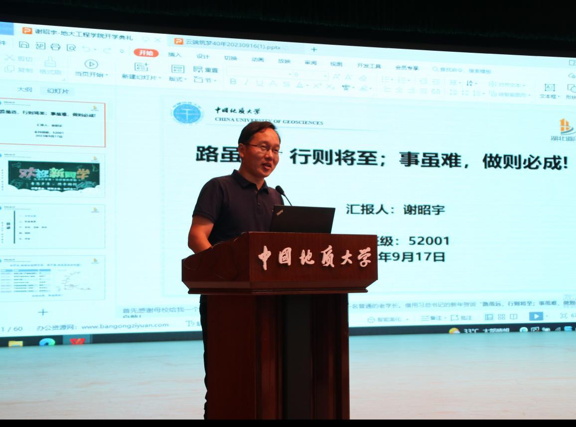 湖北道泽勘测设计院有限公司总工程师谢昭宇先生作为优秀校友代表发言。他以《路虽远,行则将至;事虽难,做则必成》为题,如数家珍地细数自己在地大求学之路上的点点滴滴,详实生动地介绍自己职场奋进之路上的酸甜苦辣,他从学历、注册、职称、创新、创业等五个方面给予学弟学妹们最真诚的建议,强调要锻炼强健体魄,勇敢应对生活挑战;要夯实专业知识,积极应对学业挑战;要参加实践活动,提前做好职场准备。谢校友的分享真诚而有趣,更加激发了同学们探索大员工活的热情。