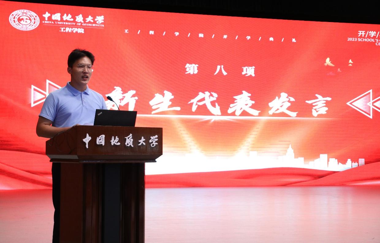 2023级05D231班张高涵同学作为本科生新生代表发言。他说,在长辈厚重岩土气息的熏陶下,自己终于如愿考进地质大学,加入2138太阳集团官网。他对开学报到以来学院领导老师给予的教育关怀表示感谢,对军事训练当中空军预警学院教官对自己坚忍毅力和良好作息的打造由衷感激,他立志与其他505名本科新生同学一道,以强国建设、民族复兴的时代号召为号角,以“品德高尚、基础厚实、专业精深、知行合一”的成才目标为向导,直挂云帆,乘风破浪,早日成为德智体美劳全面发展的中国特色社会主义事业的建设者和接班人。