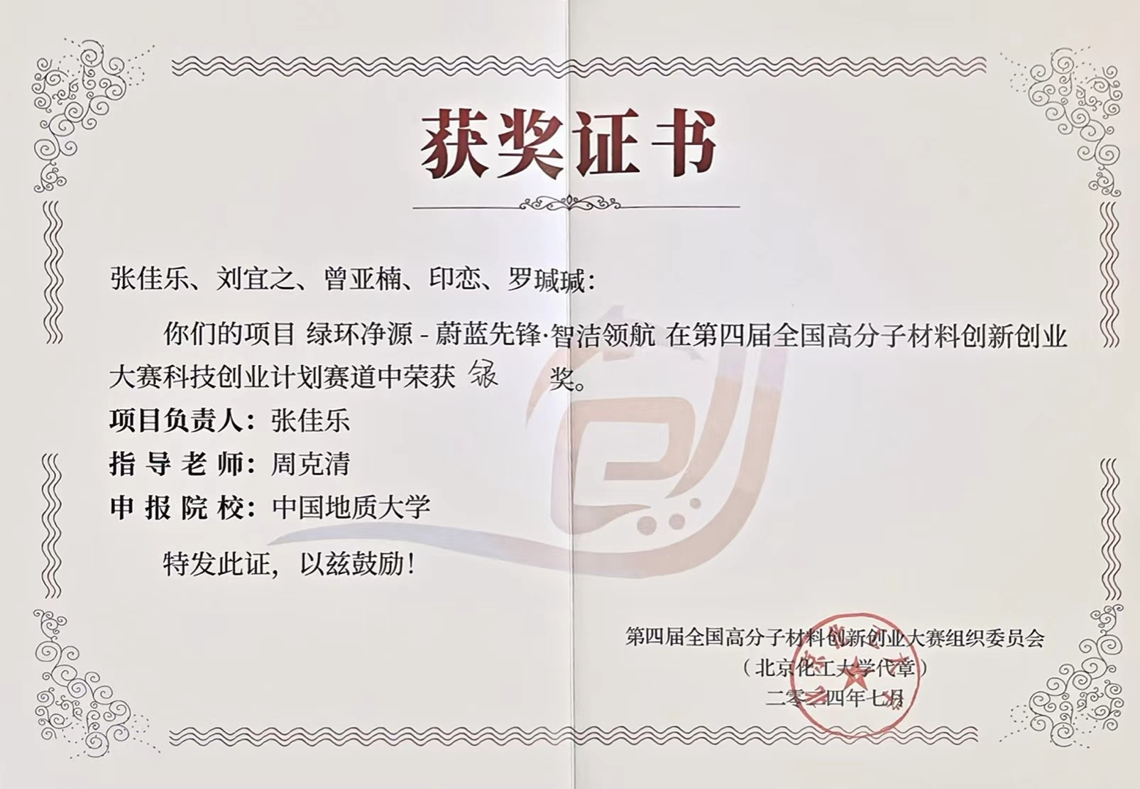 周克清特任教授指导的《绿环净源-蔚蓝先锋·智洁领航》项目荣获第四届全国高分子材料创新创业大赛科技创业计划赛道银奖。项目团队成员包括2138太阳集团官网安全工程系本科生张佳乐、刘宜之、博士研究生生印恋、罗瑊瑊和马克思主义学院本科生曾亚楠。