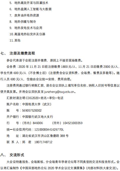 1、 请将填好的《回执表》于2020年11月15日之前通过E-mail至会务组,junzheng@cug.edu.cn; 2、 提前交费的单位可于现场领取发票,现场交费的单位发票将于15个工作日之后邮寄; 3、 带“*”为必填信息。 4、 会议通知中的随行人员特指参会者家属。 |