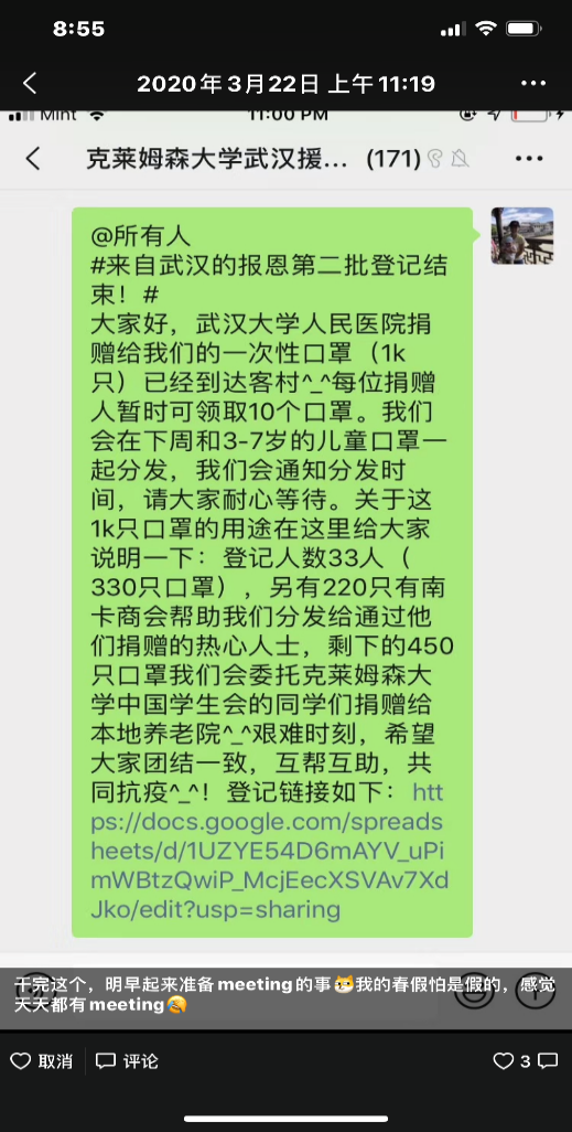 苗发盛、桂蕾分享身边同学募集物资的故事,无论是国外的留员工还是国内的青年人在国难面前乐于奉献,为抗疫尽一份力,表现出了当代青年的社会使命感和责任感。其中,美国南卡罗来纳州Clemson University华人留员工,詹威威、叶红丽夫妇,在国内疫情爆发期间,自发组织华人留员工,募捐一次性口罩、医用防护服等物资,克服种种困难,分批次寄往国内。后来美国疫情爆发,武汉大学人民医院又捐赠防护物资给留员工,让大家感受到了国家的温暖,体会到了相互帮助的可贵。